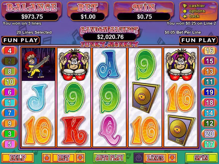 Get ready to swing into action with a slot that brings the jungle to life in the most musical way possible. Funky Monkey Slots from Real Time Gaming transforms your typical animal-themed game into a rockin' adventure where primates rule the stage and big wins are always on the setlist. This 5-reel, 20-payline video slot combines the wild energy of a jungle concert with serious cash potential that'll have you dancing all the way to the bank.
